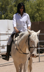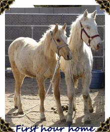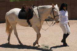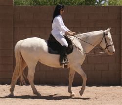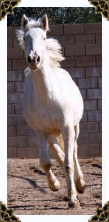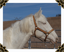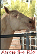 Rio is cremello color. She has blue eyes and pink skin. She came from the BLM adoption in Jan. 2006 at the age of 11 months. We were looking for a bay horse but she came up to us and licked our hand. She is a little princess who loves for you to "make her pretty" (groom) and likes to look at herself, with her river blue eyes, in the reflection of the windows. She has grown to be a large mustang. Rio also draws and paints in the dirt and on paper.